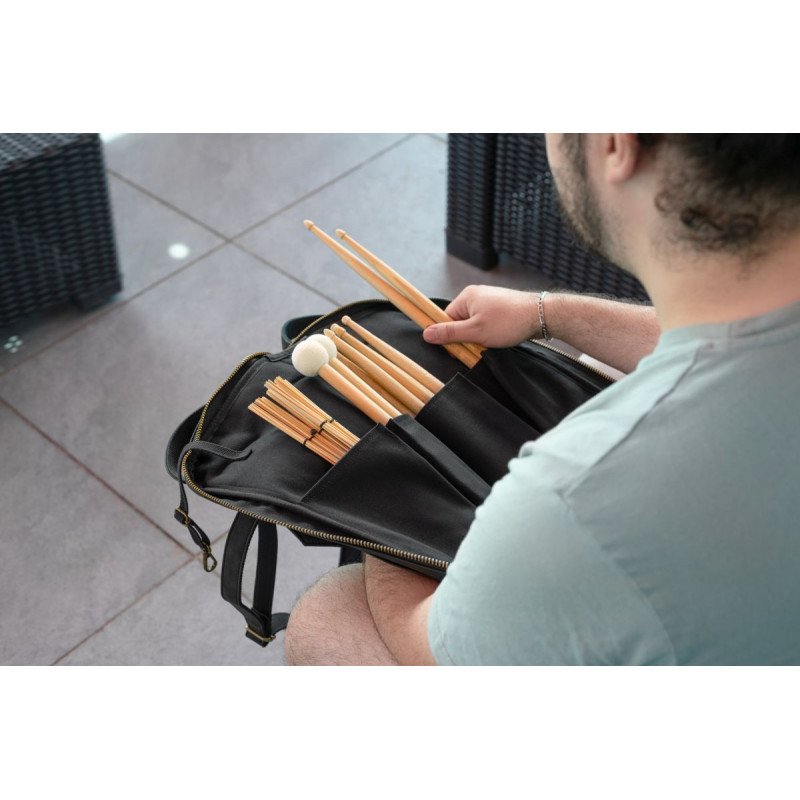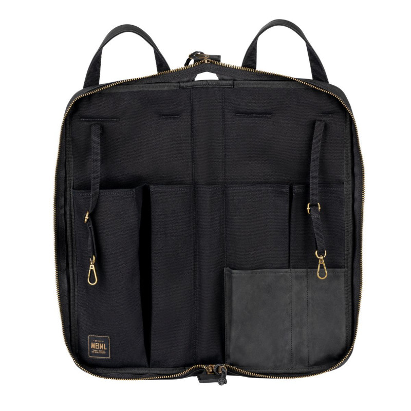 ÉTUI À DROGUES Le Meinl Vintage Hyde Stick Bag offre toute la facilité d'utilisation d'un sac de voyage au look classique. Notre extérieur en cuir synthétique ultra durable et notre intérieur en toile de coton de 24 onces garantissent une utilisation à vie. À l'intérieur du compartiment principal se trouvent cinq poches pour organiser un grand nombre de baguettes, brosses, tiges et maillets. De plus, il existe trois poches pour accessoires de différentes tailles pour accueillir des pièces plus petites ou des effets sonores. Ce sac à baguettes est équipé de crochets au sol et de sangles de longueur réglable pour le suspendre en position ouverte. La grande poche extérieure à accès rapide est dimensionnée pour les accessoires ou outils courants et se ferme pour sécuriser vos articles. Une bandoulière réglable/amovible et des poignées renforcées en similicuir vous permettent de transporter confortablement ce sac au concert ou en studio. L'accès au sac est facile grâce aux grandes languettes zippées dotées de longues tirettes en simili cuir. Les sacs Meinl Vintage Hyde sont conçus pour un style sobre et intemporel, tout en étant aussi pratiques que jamais pour tout type de batteur en voyage. Disponible en noir, marron foncé ou marron clair.