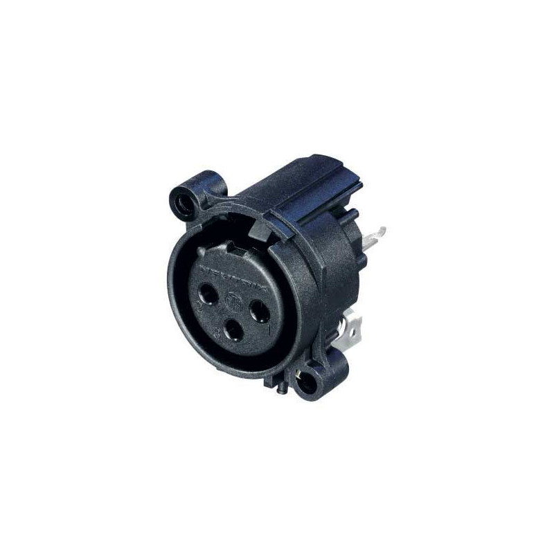 "Connecteur XLR femelle à 3 pôles, sans contact terre/coque, montage horizontal sur PCB, avec ressort de retenue au lieu de loquet. Le connecteur de panneau XLR à montage sur PCB à corps rond le plus rentable. La découpe du panneau avant et la disposition du PCB sont 100 % compatibles avec la série A. Conception de contact « tulipe » avec une pression de contact élevée pour une durabilité maximale. Indice d'inflammabilité UL94HB. Composant reconnu UL.'
