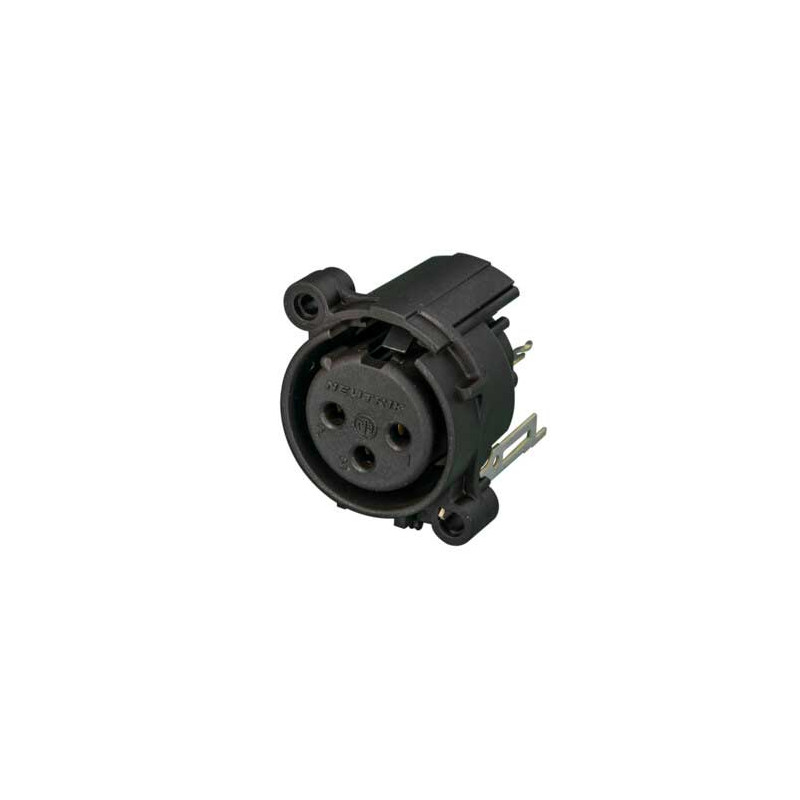 Prise femelle XLR 3 pôles, mise à la terre : contact de terre séparé pour le boîtier du connecteur et le panneau avant, montage vertical sur PCB, ressort de retenue au lieu du loquet. La prise de nouvelle génération. Connecteur de panneau XLR à montage sur PCB à corps rond en plastique. Ceux-ci ont la plus petite taille et la densité d’emballage la plus élevée (23 mm centre à centre). Contacts de type tulipe de nouvelle conception avec placage en or dur et zones de contact polies. Composant reconnu UL.