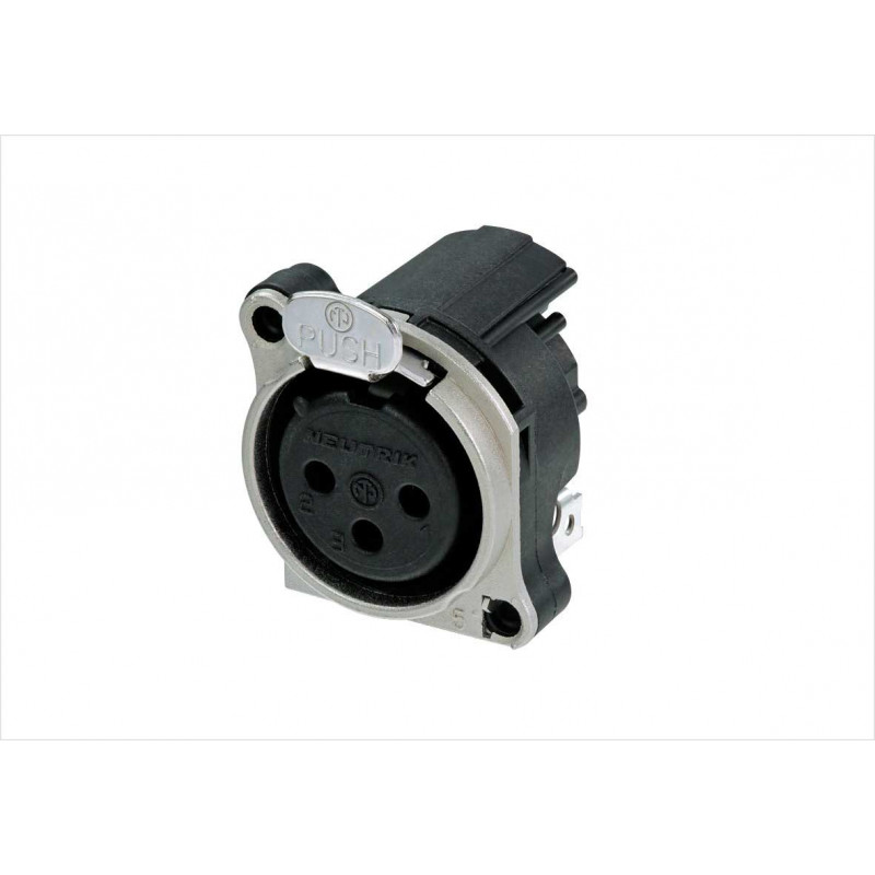 Prise femelle XLR 3 pôles, connexion à la terre : boîtier du connecteur correspondant à la broche 1 et au panneau avant, montage horizontal sur PCB. Identique à la série A, à l'exception d'une bride de montage métallique qui présente un contact de terre continu circonférentiel avec le châssis pour une meilleure pratique CEM. . Composant reconnu UL.