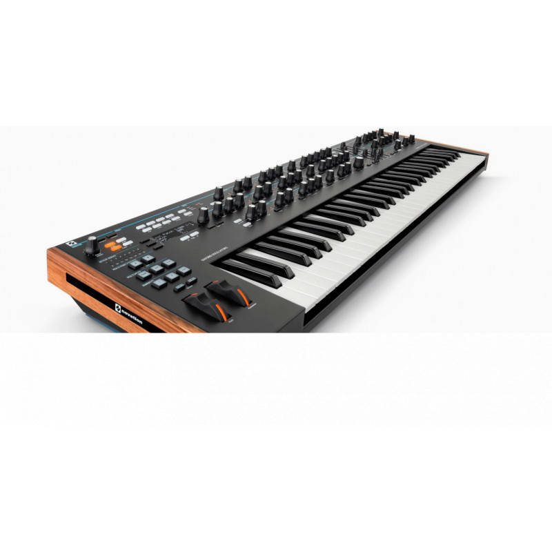 CLAVIER DE SYNTHÉTISEUR PROFESSIONNEL Synthétiseur polyphonique multitimbral à 16 voix en 2 parties. Trois oscillateurs NCO New Oxford par voix permettent une synthèse soustractive, à table d'ondes ou FM. Filtre analogique multimode 12/24dB par voix avec mode Dual. Action de clavier 5 octaves semi-lourde de qualité supérieure avec sensibilité à la vélocité et aftertouch. Effets par partie : distorsion, chorus, delay et reverb. Entrée audio stéréo routable vers les effets intégrés et les sorties auxiliaires.