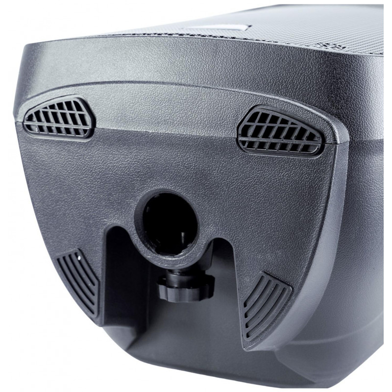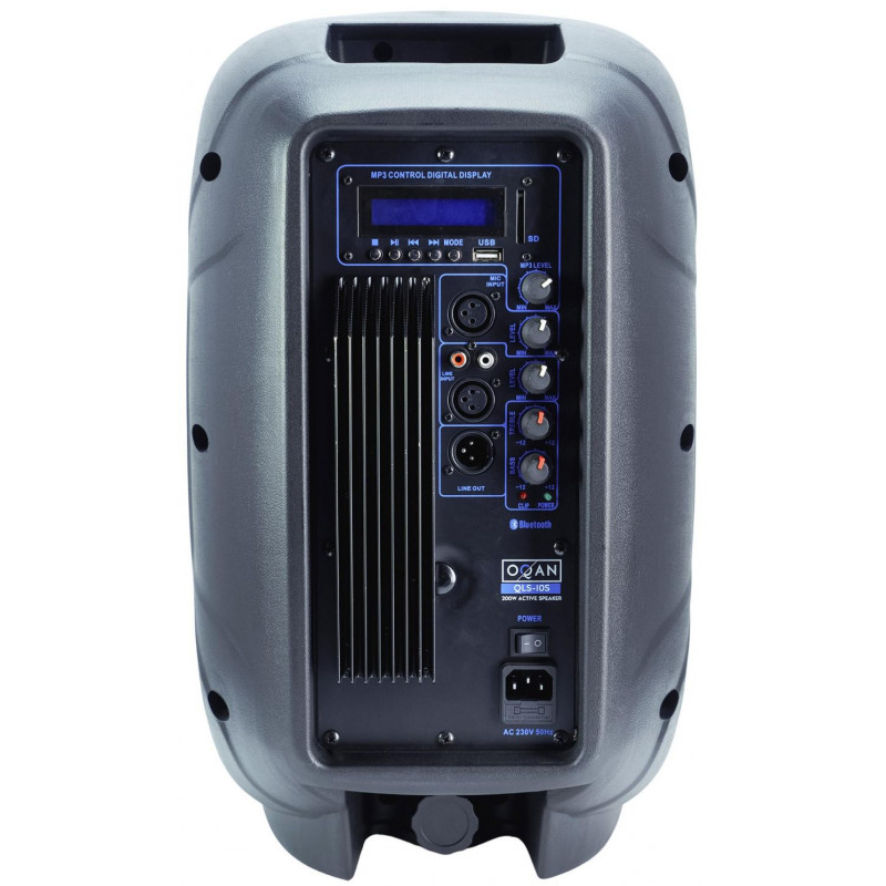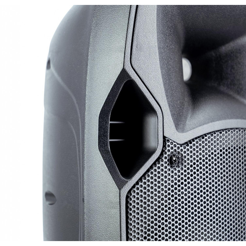 HAUT-PARLEUR DE PA AMPLIFIÉ Enceinte active multifonction. Puissance maximale de 250 W – 125 W RMS. Classe AB. haut-parleur 10" Impédance 8 ohms. Réponse en fréquence 60 Hz-20 Khz. Égaliseur à deux bandes. Entrée micro (XLR et Jack1/4') et Aux IN (RCA)/MP3. Sortie ligne OUT (XLR). Égaliseur 2 bandes. Lecteur USB, SD, Bluetooth et Radio FM intégré. Télécommande IR. Écran LCD. LED de puissance et de saturation. Douille standard de 1-3/8' (35 mm). Possibilité d'utilisation comme moniteur de sol. Poids environ 8Kg. Dimensions 300 x 250 x 490 mm.