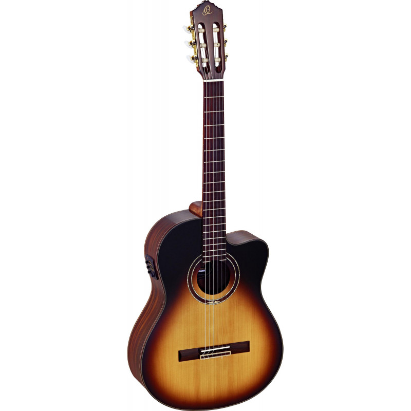GUITARE ELECTROACOUSTIQUE CORDES NYLON Guitare classique électrifiée avec coupe Feel Series. Table en épicéa de Sitka massif, dos et éclisses en palissandre, manche en acajou. Col mince, col plus étroit. Noyau réglable. Touche en palissandre Préampli Magus Pro avec accordeur. Finition Sunburst tabac. Étui et sangle de luxe inclus.
