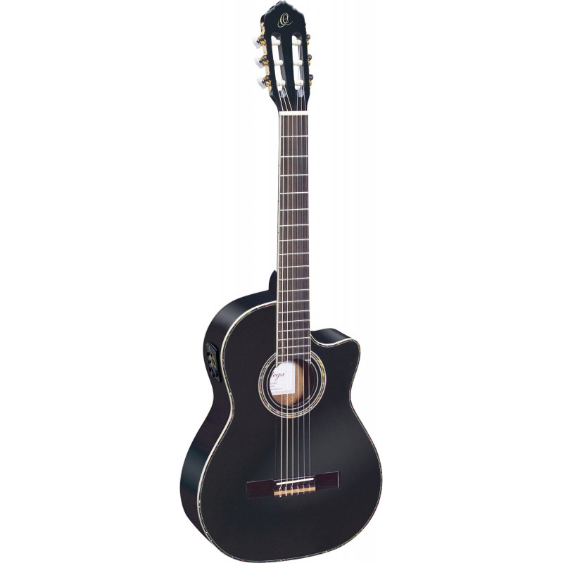 GUITARE ELECTROACOUSTIQUE CORDES EN NYLON Guitare classique électrifiée avec pan coupé de couleur noire.