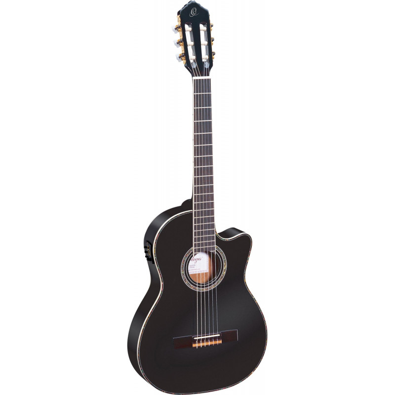 GUITARE ELECTROACOUSTIQUE CORDES EN NYLON Guitare classique électrifiée avec pan coupé de couleur noire.