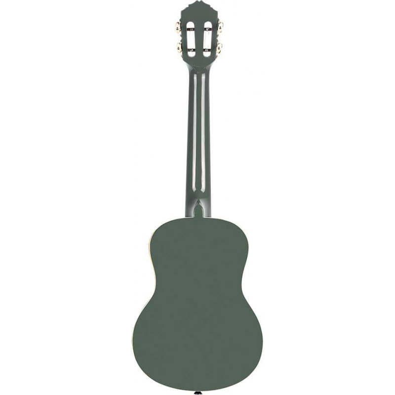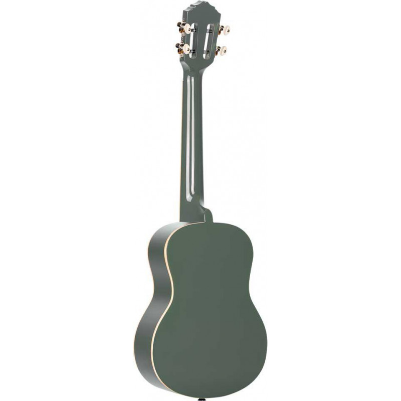 TENOR UKELELE RUGA-PLT Ukulélé ténor de la série Gaucho. Top Agathis de couleur gris platine brillant. Agathis dos et éclisses. Reliure en ABS ivoire. Manche en Okoumé brillant. Poupée de style classique avec feuille d'okoumé. Touche et chevalet en noyer. Incrustations d'érable sur la touche. Mécaniques chromées avec bouton blanc. Pickguard blanc en forme de larme. Étui inclus avec des détails colorés assortis à la finition du ukulélé.