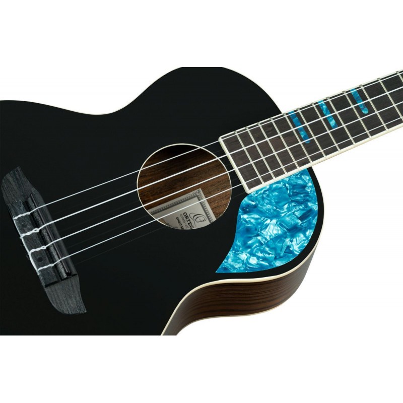 UKELELE 'Le ukulélé GHOST SERIES d'Ortega Guitars séduit par sa table brillante et saisissante. Les plateaux colorés (noir, océan, rouge teint et platine) s'harmonisent à merveille avec la finition brillante du dos et des éclisses en palissandre. En particulier, ce ukulélé présente de superbes incrustations de « barre » en perles bleues et un pickguard en perles bleues, ajoutant une touche d'élégance à son apparence. Le placage de la poupée en palissandre complète l'esthétique générale et complète le magnifique design de l'instrument. Les instruments GostSeries sont livrés avec l'étui professionnel Ortega Guitars. Taille : ténor. Largeur de l'écrou : 35 mm (1,38"). Échelle : 430 mm (16,93"). Taille ténor Table : Epicéa massif, finition brillante Finition : Noir Dos et éclisses : Palissandre, finition brillante Manche : Acajou, finition satinée Placage de tête de manche : Palissandre, finition brillante Touche et chevalet : Palissandre Filet : ABS blanc Sillet et sillet : ABS noir Perle bleue Incrustations « Bar » Plaque de protection « GHOST » Blue Pearl Logo Blue Pearl Dos arqué Goupille de sangle, or Échelle : 430 mm (16,93") Largeur au sillet : 35 mm (1,38") Étui professionnel inclus'