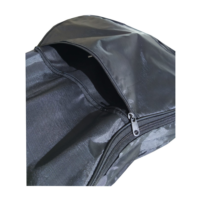 Étui de guitare en polyester plastifié avec ouverture zippée sur le côté gauche, poignée positionnée sur le côté gauche et une sangle extensible à l'arrière.