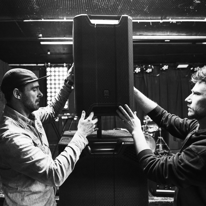 Grâce à ses rainures moulées et à ses deux puits pour mât d'enceinte M20, le caisson de graves peut être empilé en toute sécurité aussi bien à l'horizontale qu'à la verticale et intégré de manière flexible.