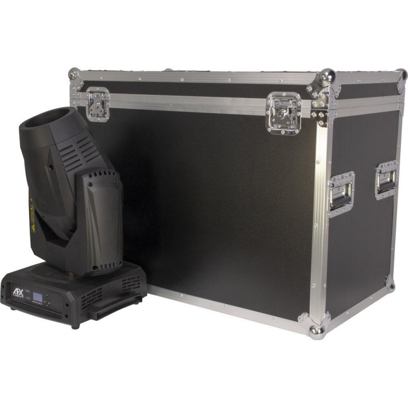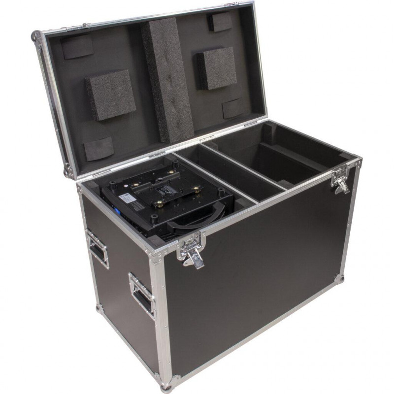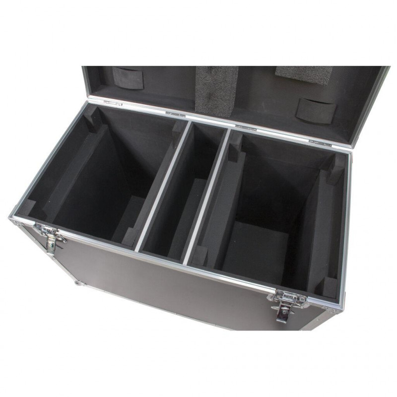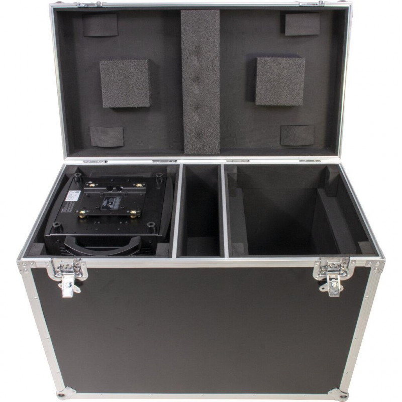 Flight case su ruote appositamente progettato con 2 scomparti per le teste mobili e uno scomparto centrale per gli accessori.