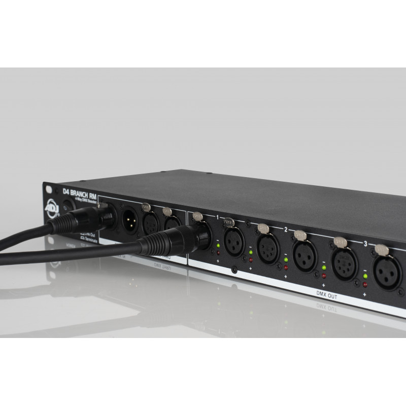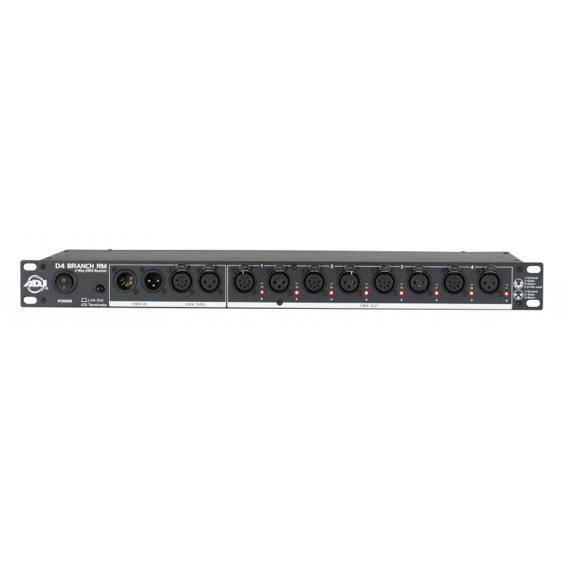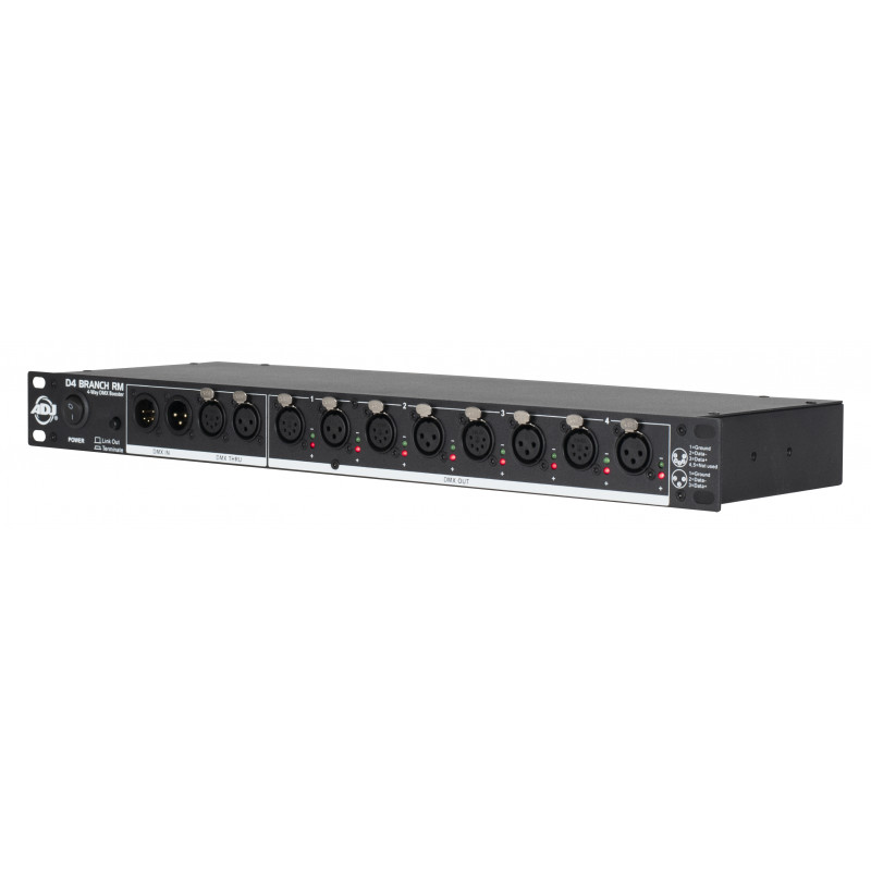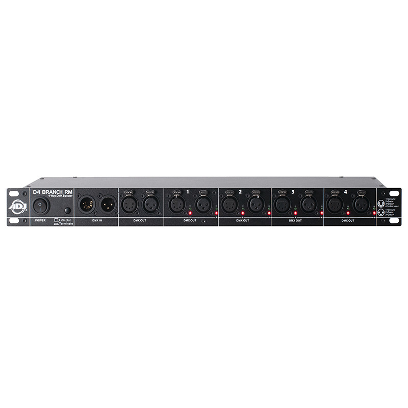 • 4-Way DMX Data Splitter / Fully DMX512 (1990) Compliant/n • Link / Terminate Button for Easy Troubleshooting/n • DMX Status LED Indicator/n • (1) 3pin + (1) 5pin XLR Isolated Inputs/n • (1) 3pin + (1) 5pin XLR Passive Loop Output/n • (4) 3pin + (4) 5pin XLR Isolated Outputs/n