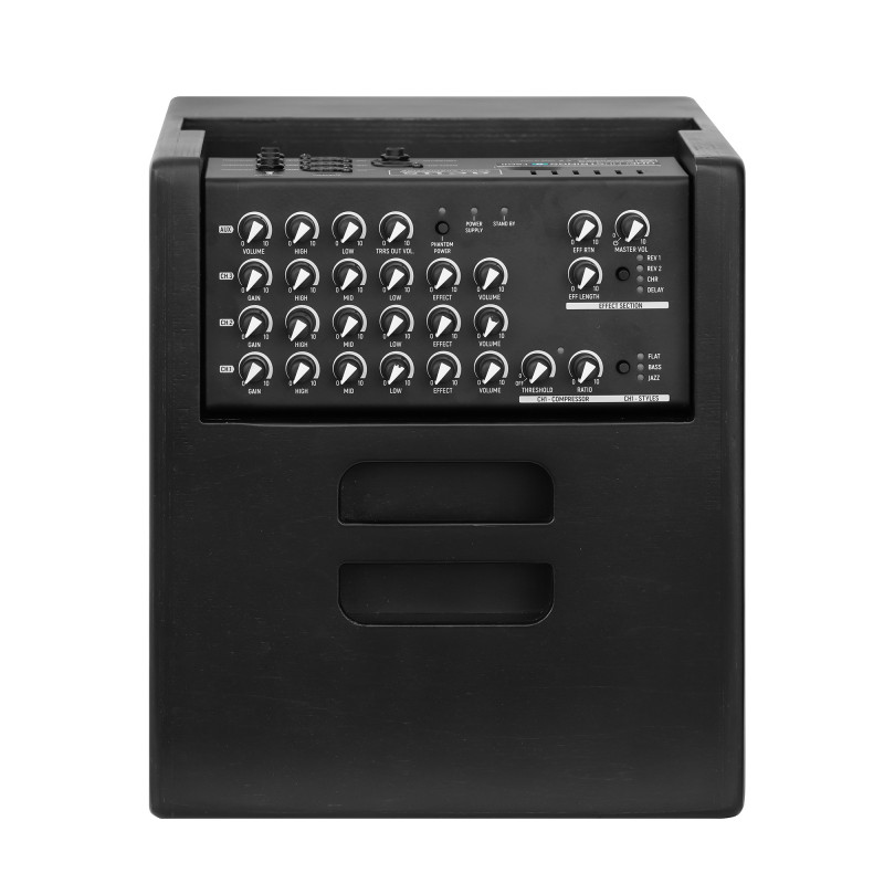 I 3 ingressi hanno controllo del guadagno, EQ a 3 bande, invio effetti e volume. L'ingresso 1 offre funzioni aggiuntive, tra cui un compressore e un interruttore che regola le caratteristiche del canale in base al tipo di strumento selezionato: