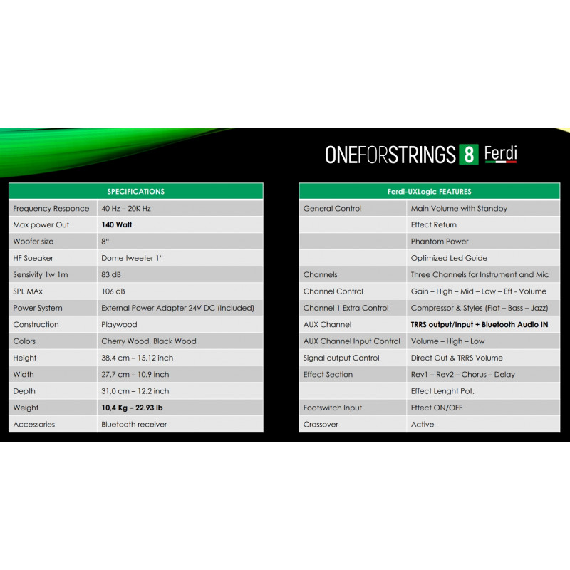 L'amplificatore ONEFORSTRINGS 8FERDI è un potente amplificatore da 150 watt, progettato per chitarre acustiche e classiche. Dispone di 3 ingressi separati, più un ingresso Aux (ingresso/uscita audio TRRS e/o audio Bluetooth), ciascuno con controllo del volume indipendente ed equalizzatore a 2 bande.