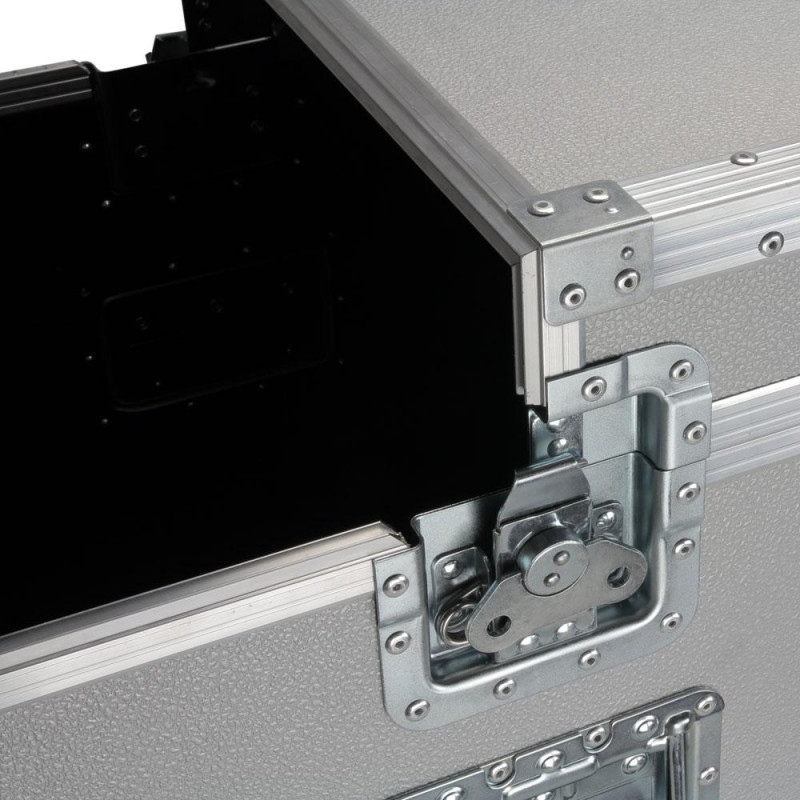 Il fermo Split-Lid-Butterfly di Adam Hall facilita la costruzione di flight case con coperchi o coperture suddivisi. Per prima cosa, il numero di chiusure a farfalla si riduce da quattro a due in molti casi, poi non occorre alcun passaggio dispendioso del profilo di incastro agli angoli. Senza contare inoltre il vantaggio derivante dal numero minore di chiusure da azionare.