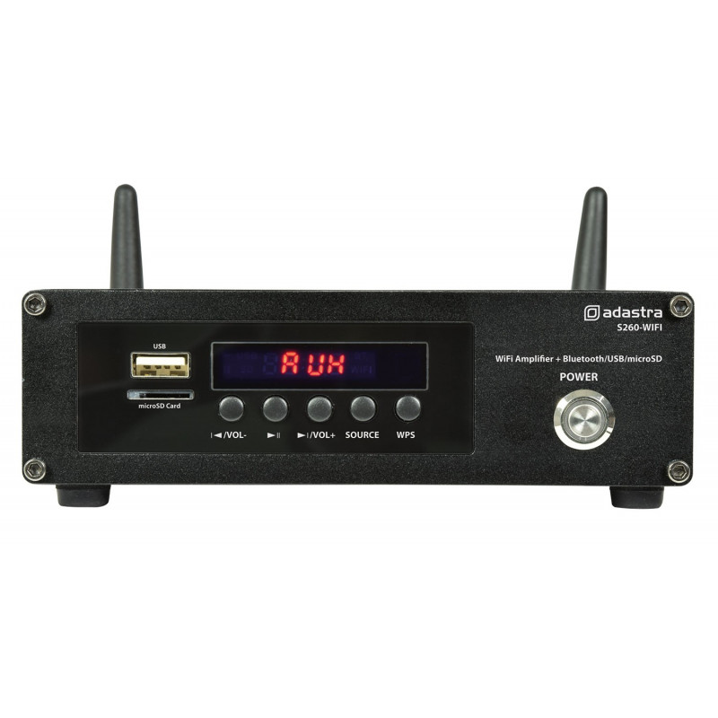 Amplificatore miniaturizzato in Classe D che fornisce fino a 2 x 60 Wrms in uscita con funzionalità di streaming Bluetooth e WiFi. Controllato da uno smartphone Android o iOS, l'S260-WIFI supporta app gratuite per lo streaming di musica e podcast direttamente da una rete WiFi. La radio Internet integrata offre audio digitale di alta qualità da quasi tutte le stazioni radio online o podcast disponibili in tutto il mondo. I servizi in abbonamento possono memorizzare playlist online che possono essere ascoltate in streaming direttamente da Internet senza che lo smartphone debba essere connesso alla rete. Lo streaming wireless dei brani e delle playlist memorizzate sullo smartphone può essere inviato dall'app o direttamente tramite Bluetooth all'amplificatore. Se necessario, è possibile selezionare un ingresso di linea per il collegamento a una TV, un CD, un DVD o un altro dispositivo di riproduzione. Inoltre, l'S260-WIFI dispone di ingressi USB e scheda microSD per la riproduzione dei brani memorizzati. Fornisce una versatile soluzione musicale di sottofondo "a mani libere" per la riproduzione continua di musica da servizi Internet o una selezione di altre fonti per bar, caffetterie, ristoranti, aree di ricevimento e feste in casa.