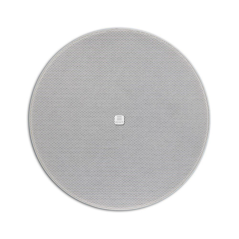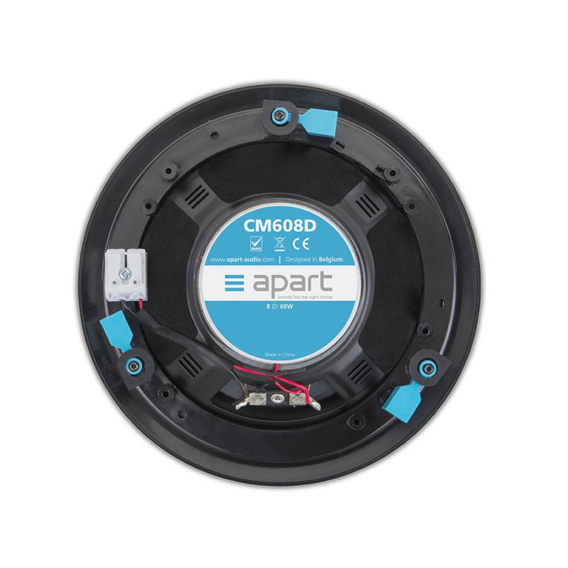 Apart CM608D è un diffusore da soffitto dal design elegante che integra da 2 a 8 ohm. Il sistema ha un woofer da 6 ½ "e un tweeter coassiale da 1". CM608D è la scelta perfetta per un'adeguata distribuzione di sistemi di avviso e di musica ambientale. Il telaio di montaggio è realizzato in ABS di alta qualità. La griglia di acciaio rimane sul posto grazie all'azione di potenti magneti al neodimio. Griglia magnetica rimovibile con bordo sottile Griglia di bordo molto sottile per un elegante integrazione interna di design. Cornice per altoparlanti con magneti al neodimio integrati per un'installazione robusta, stabile e facile. Connettore Quick Fit (70 - 100 V) Connessione rapida tramite pratici morsetti di pressione con connessione di ingresso e uscita per cavi di altoparlanti con un diametro del cavo fino a 2,5 mm. Estremamente conveniente grazie a tempi di installazione più rapidi e senza necessità di scatole di giunzione. Etichette del trasformatore La chiara segnalazione con i colori sul trasformatore indica - in un batter d'occhio - quale presa di corrente deve essere utilizzata. Connettore aggiuntivo Quick Fit (bassa impedenza) Connettività a bassa impedenza e facile scollegamento del trasformatore attraverso il morsetto di pressione. Robusto connettore Quick Fit montato sul telaio del diffusore. Connessione di ingresso e uscita per cavi dei diffusori fino a 2,5 mm.