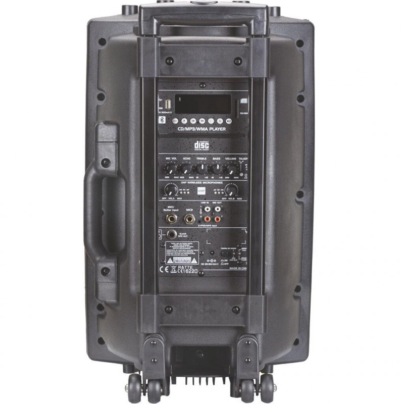 Sistema audio polivalente, solido e autonomo, all'interno di un involucro in ABS che ti offre totale libertà di movimento, grazie alla sua batteria ricaricabile integrata, ai suoi due microfoni UHF e alla connessione Bluetooth. Niente più cavi, ideale per club sportivi, animatori, street dance, karaoke...