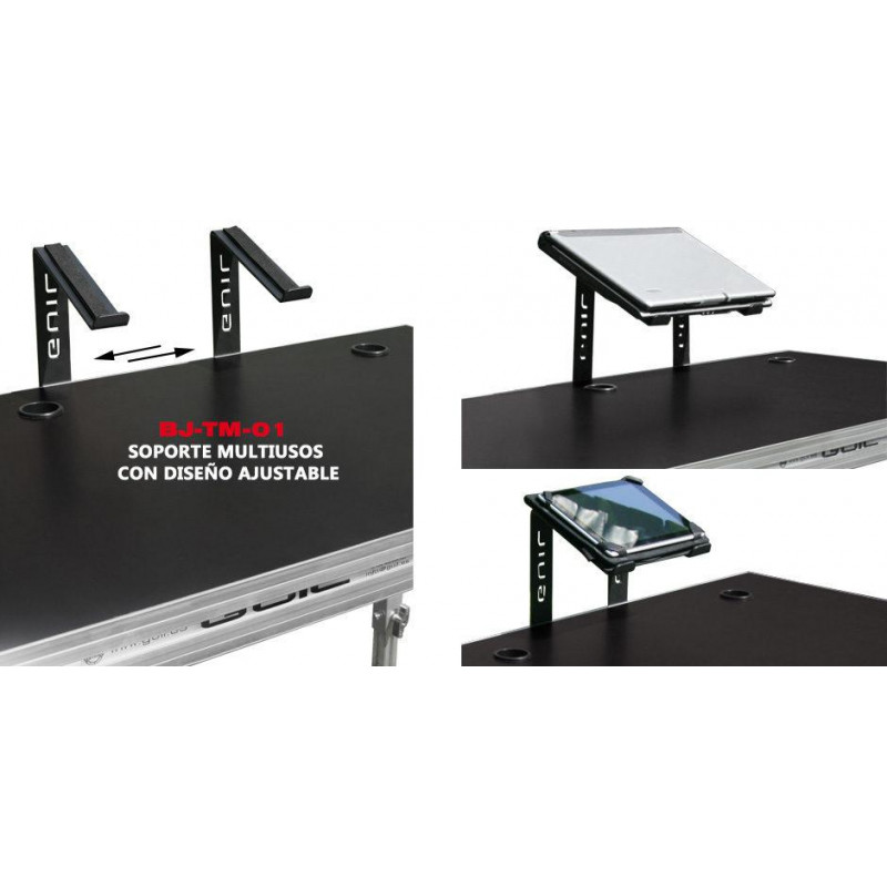 Il supporto ref. BJ / TM-01 è dotato di due bracci indipendenti che sono fissati alla piattaforma da manopole ergonomiche. Questo sistema di fissaggio consente di regolare la distanza tra loro e quindi di ospitare dispositivi di diverse dimensioni (iPad, laptop, ecc.).