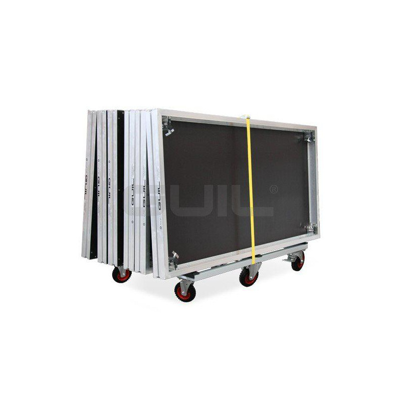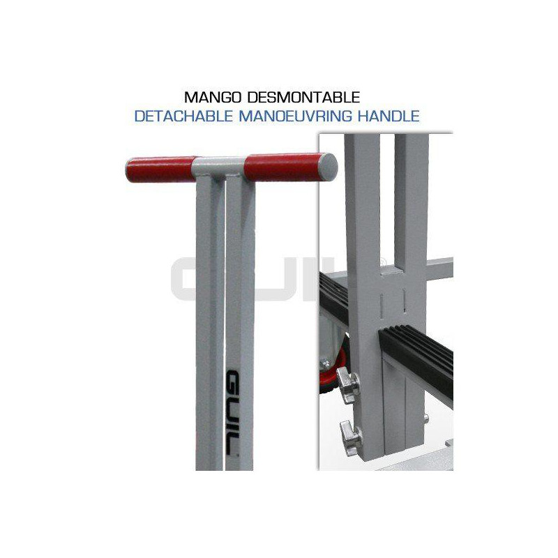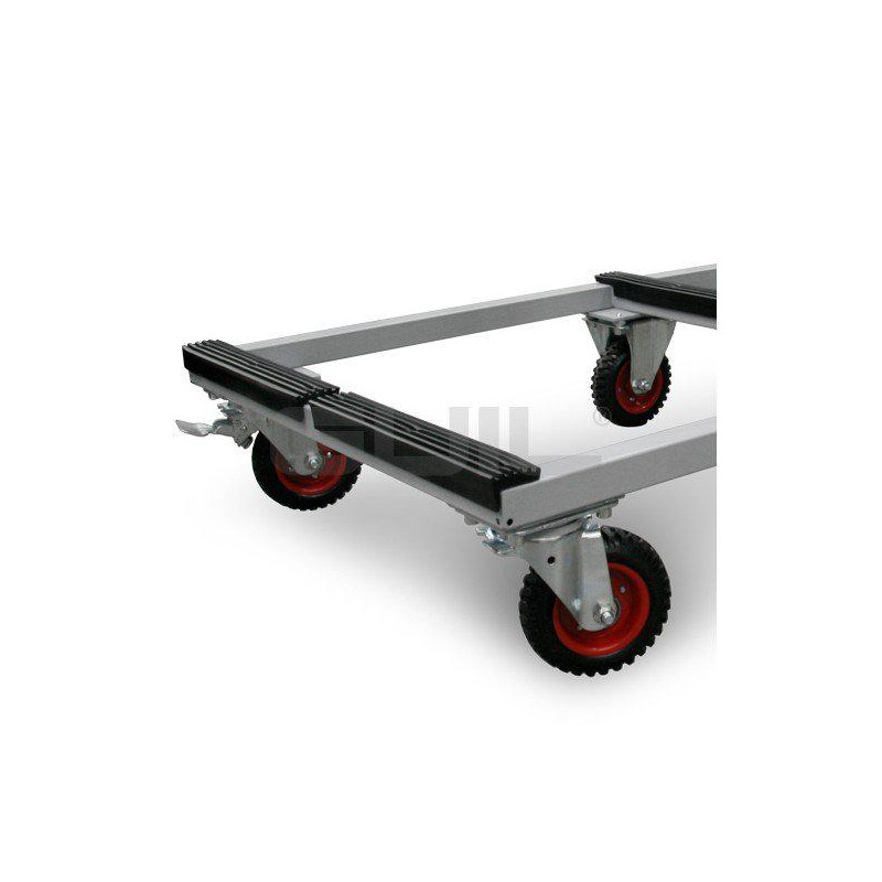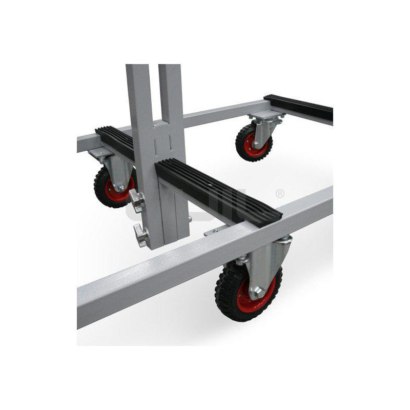 - Le sue 6 ruote (4 girevoli e 2 fisse) in gomma piena per evitare graffi o segnare il terreno, gli consentono di ruotare sullo stesso asse, dandogli grande mobilità in spazi ridotti e facilitando la sua movimentazione da parte di una sola persona. Perfetto per hotel, auditorium ... dove dobbiamo allestire piccole tappe itineranti.