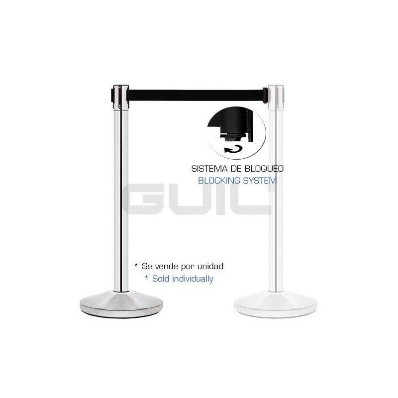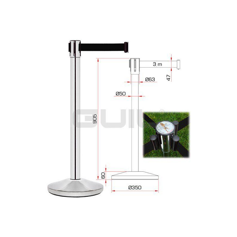 Pilastro con nastro retrattile da 3 m con attacco a tre vie e sporgenza che consente il fissaggio di 4 nastri su un solo palo. Ha un sistema di blocco per impedire la rimozione del nastro.