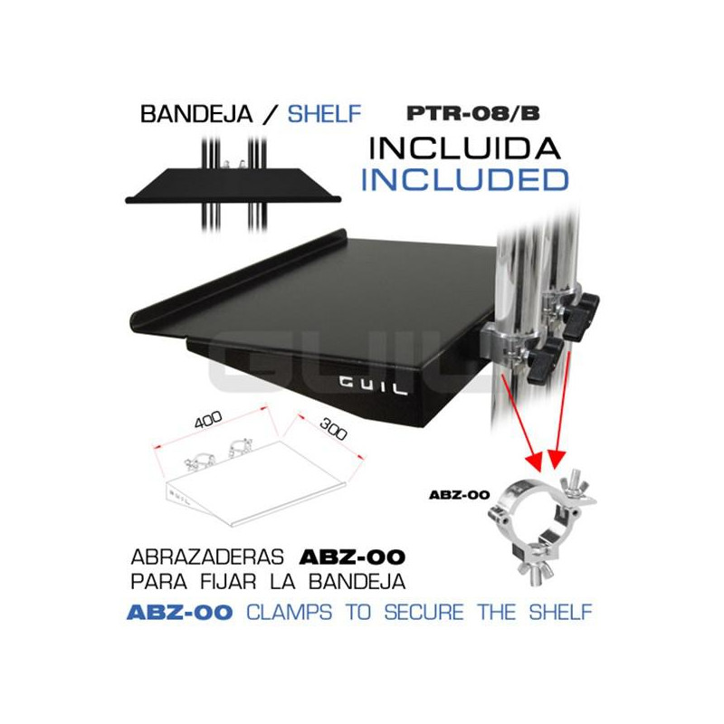 - Il supporto è fornito con un vassoio mobile (Ref. PTR-08 / B) molto pratico per posizionare DVD, laptop, proiettori, ecc. (facile fissaggio tramite doppio morsetto in alluminio, ABZ-00).