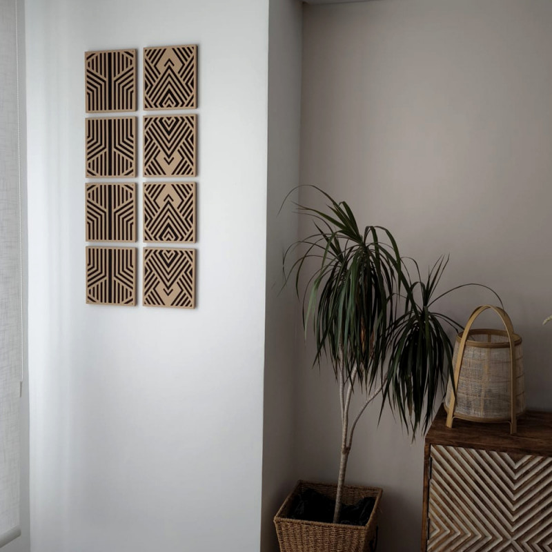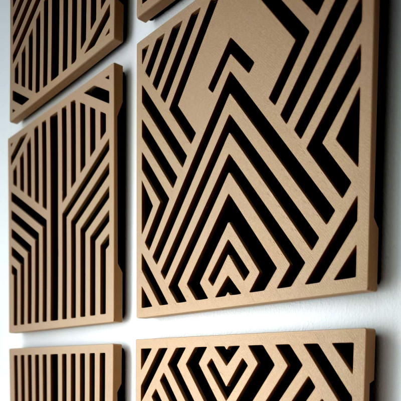 Panel acústico decorativo con diseño geométrico y espuma de alta densidad. Mejora la acústica del espacio mientras aporta estilo y calidez visual. Ideal para estudios, oficinas y hogares.
