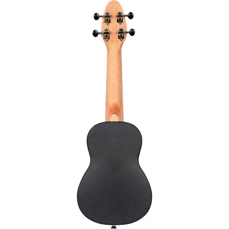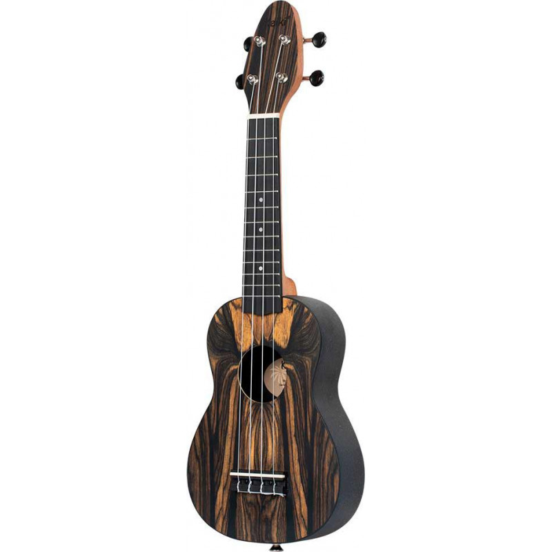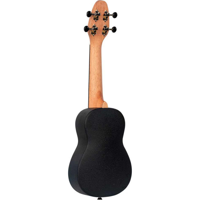 UKELELE SOPRANO Confezione Ukulele Soprano + accordatore + tracolla + plettri + borsa per il trasporto. Ukulele con tastiera a ponte e fondo in fibra arrotondato. Piano in legno di ebano bianco