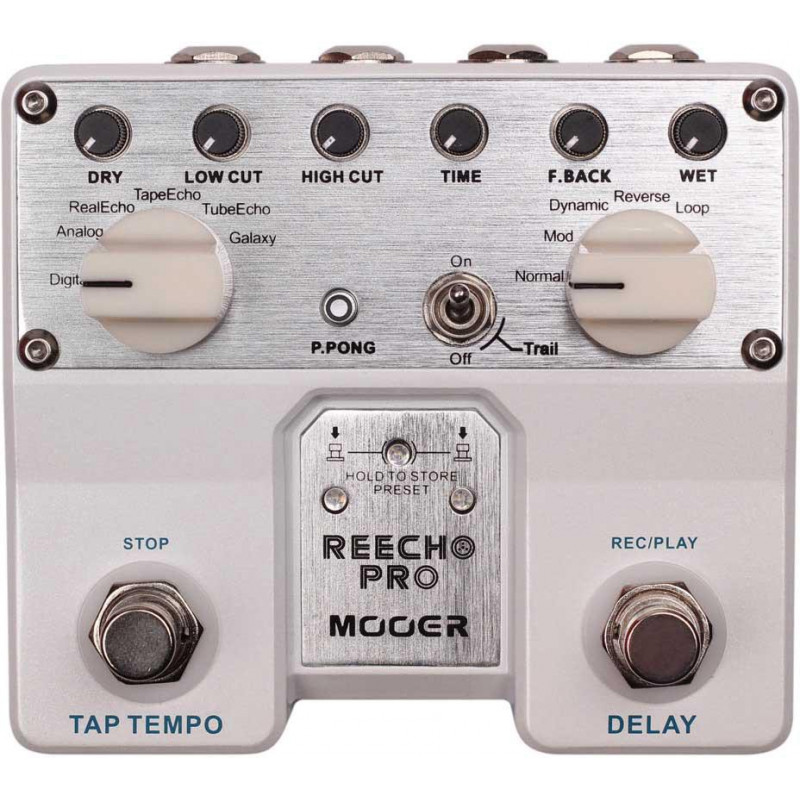 ECHO PEDAL (DLY/RVB) 6 effetti delay: Digital, Galaxy, Analogy, Real Echo, Tape Echo e Tube Echo con 5 modalità ciascuna incluso l'effetto Reverse. Con funzioni di memoria per aggiungere loop, tutto in un pedale e molto facile da usare. Combina gli effetti sugli ingressi e sulle uscite stereo, quindi la sensazione sonora è totale. Con Tap Tempo per rendere molto semplice la regolazione del tempo di ritardo, da un ritardo pulito a uno totalmente psichedelico e galattico. Control Trail per passare da Buffer Bypass a True Bypass.