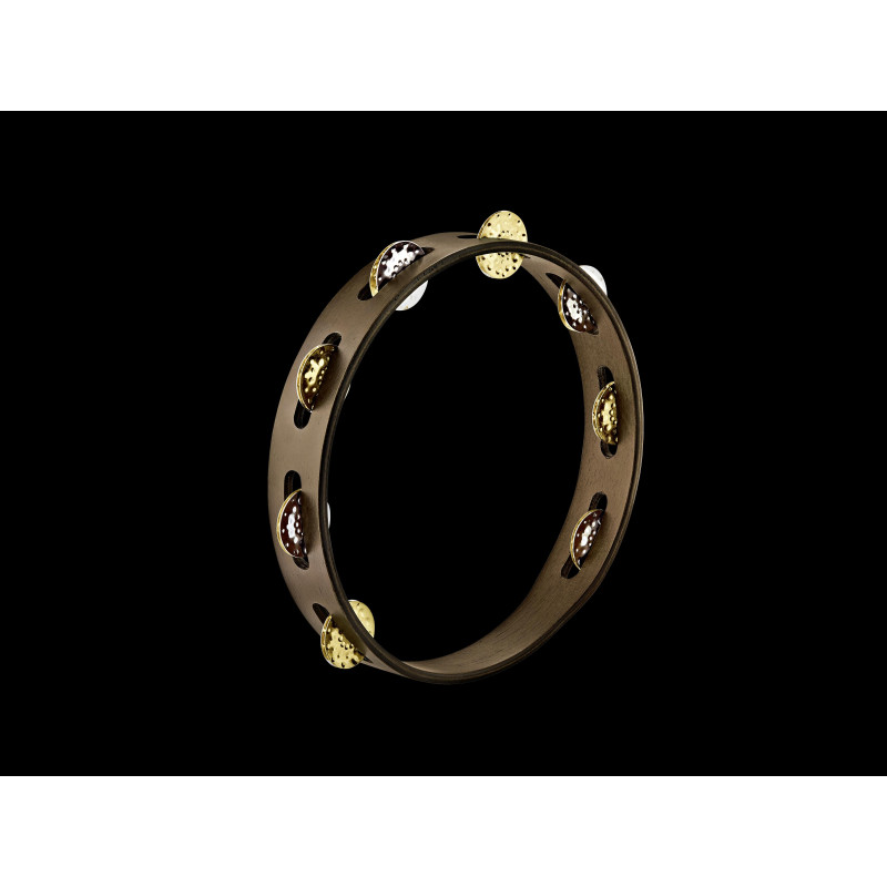 PANDERETA Tamburello con una fila di sonagli, bronzo misto e sonagli d'argento, finitura marrone.