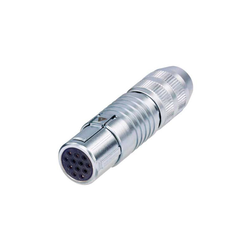Connettore per cavo femmina a 12 poli, con serracavo di tipo a mandrino e contatti a saldare.Il MINICON CONNECTOR, con il suo design flessibile e compatto, è perfettamente adatto per applicazioni multipolare/industriali. Questo robusto connettore miniaturizzato in metallo offre un meccanismo di bloccaggio push-pull e presenta un eccellente rapporto costo/prestazioni.