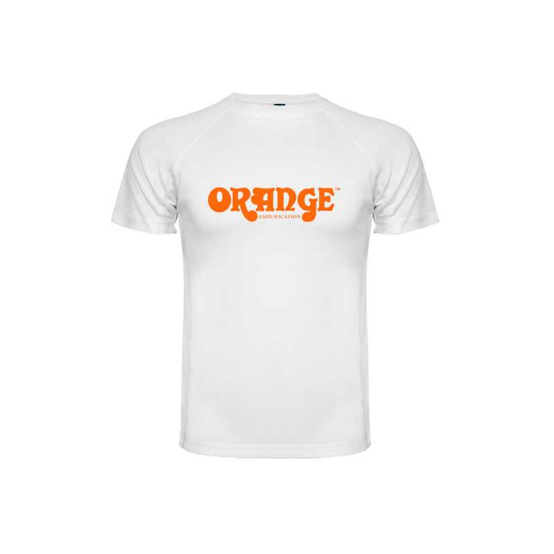 T-shirt bianca con logo arancione. Taglia L.