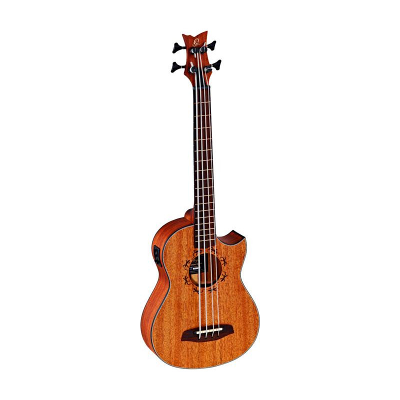 UKELELE BASS Serie elettroacustica U-Bass ELETTRICA A 4 corde LIZZY-PRO Lizard. Corpo e manico in mogano con doppio nucleo, top in mogano massiccio inciso al laser con design a lucertola, tastiera e ponte pao ferro. Finitura naturale satinata. Teste di macchina in raso nero. Rilegatura in ABS nero con profilo bianco. Ortega Magus Usa l'elettronica con il sintonizzatore. Aquila Thundergut Ukebass supporto per corda longscale. COMPRENDE COPERTINA DELUXE E CINTURINO IN NYLON. Scala 625 mm