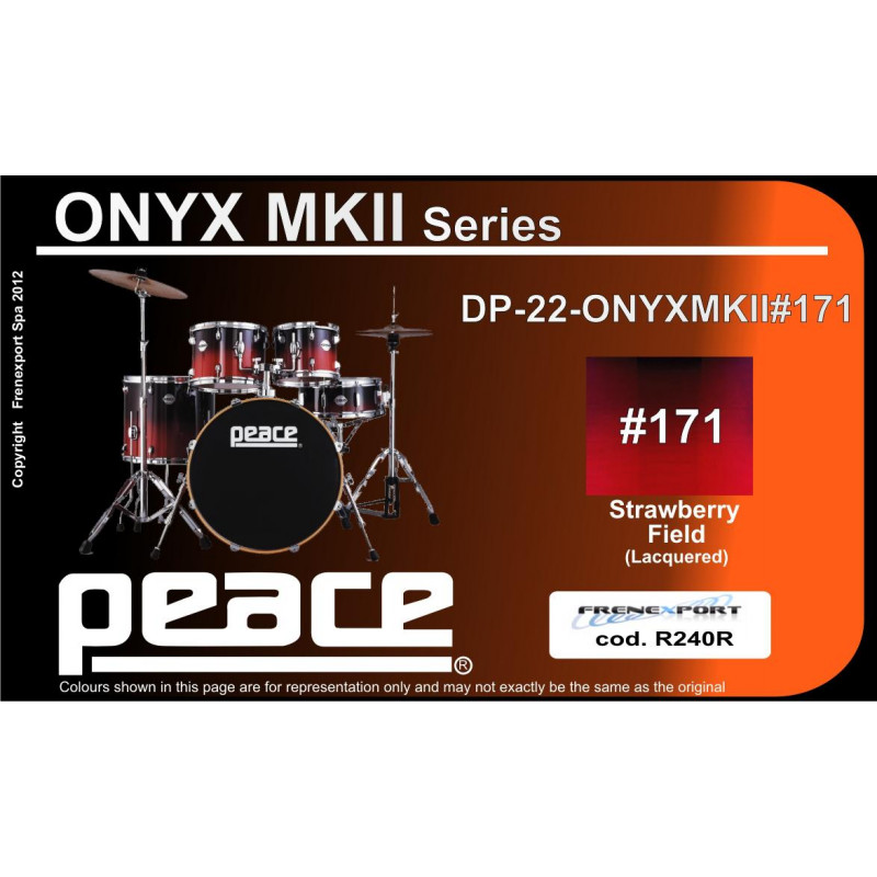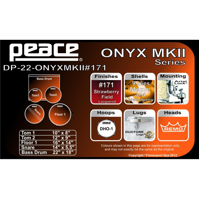 Dopo il successo della prima serie Peace lieta di annunciare la nuova linea ONYX MK2. Rimanendo fedeli alla scelta vittoriosa di utilizzare fusti in Acero e Mogano 9 strati, si provveduto a rivedere alcuni particolari al fine di stare al passo con le esigenze che mutano continuamente come ad esempio l'adozione del sistema di sospensione toms Arial-Lock"! e l'utilizzo di timpani a terra e non pi sospesi. Sono ora disponibili 2 set con dimensioni differenti rispettivamente con cassa da 20" e 22" e toms di nuova generazione ad altezza ridotta. Le finiture laccate, che hanno reso popolare questa serie, sono riproposte con livree innovative come la nuova "Power stripe", l'elegante "Lapis Lazuli" e la spettacolare "titanium Alloy".