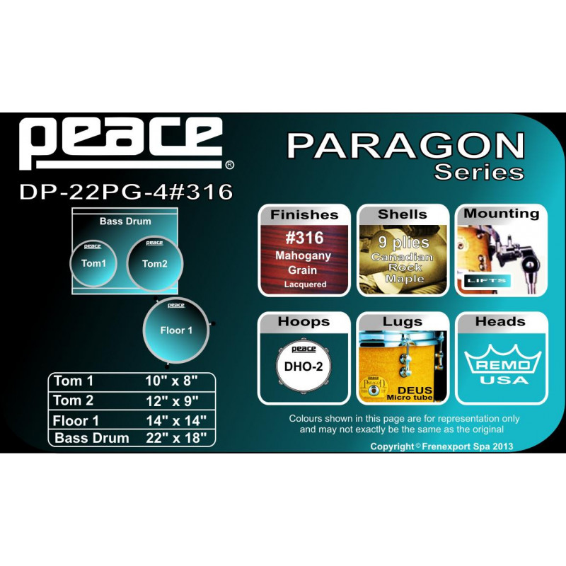I veri appassionati di batteria scelgono da sempre fusti in Acero. E' per questo che il team Peace ha sviluppato la serie PARAGON, creando fusti in Acero Canadese da 9 strati. Semplicemente "il meglio del meglio". L'ampia gamma di misure e livree disponibili danno al musicista, sia esso professionista o amatore, la possibilit di personalizzare il proprio set in base alle pi disparate esigenze.L'utilizzo dei sistemi brevettati LIFTS"! per il supporto dei toms e delle meccaniche DEUS Microtube"! favoriscono una migliore e facile accordatura nonch la possibilit di cambiare le pelli con il fusto montato all asta.Il look accattivante, il suono superlativo ed una costruzione visibilmente tecnologica rendono la PARAGON una serie che non lascia spazio a compromessi.I pacchetti standard prevedono la fornitura dei soli fusti insieme ai quali possibile ordinare separatamente tutti gli accessori del vasto catalogo Peace.