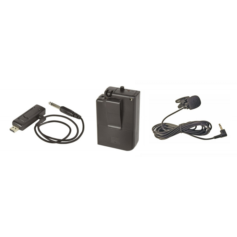 Set microfonico wireless UHF compatto e facile da configurare con microfono da bavero, trasmettitore da cintura e ricevitore USB. Il ricevitore si collega semplicemente a un alimentatore USB o a una porta USB per l'alimentazione e viene inviato a una presa jack da 3,5 mm. Sul ricevitore è fornita una connessione USB collegabile per consentire di continuare a utilizzare la porta USB per la connessione a supporti o altri dispositivi USB (ad esempio, per una porta USB flash per lettore mp3). Il trasmettitore da cintura è alimentato da 2 batterie AA e funziona su una delle 2 frequenze UHF. Questo sistema evita la necessità di un ricevitore autonomo o montato su rack e può funzionare da una fonte di alimentazione USB standard per la massima comodità.