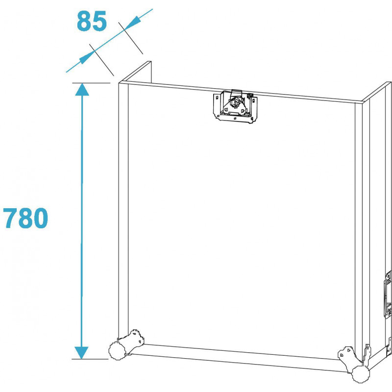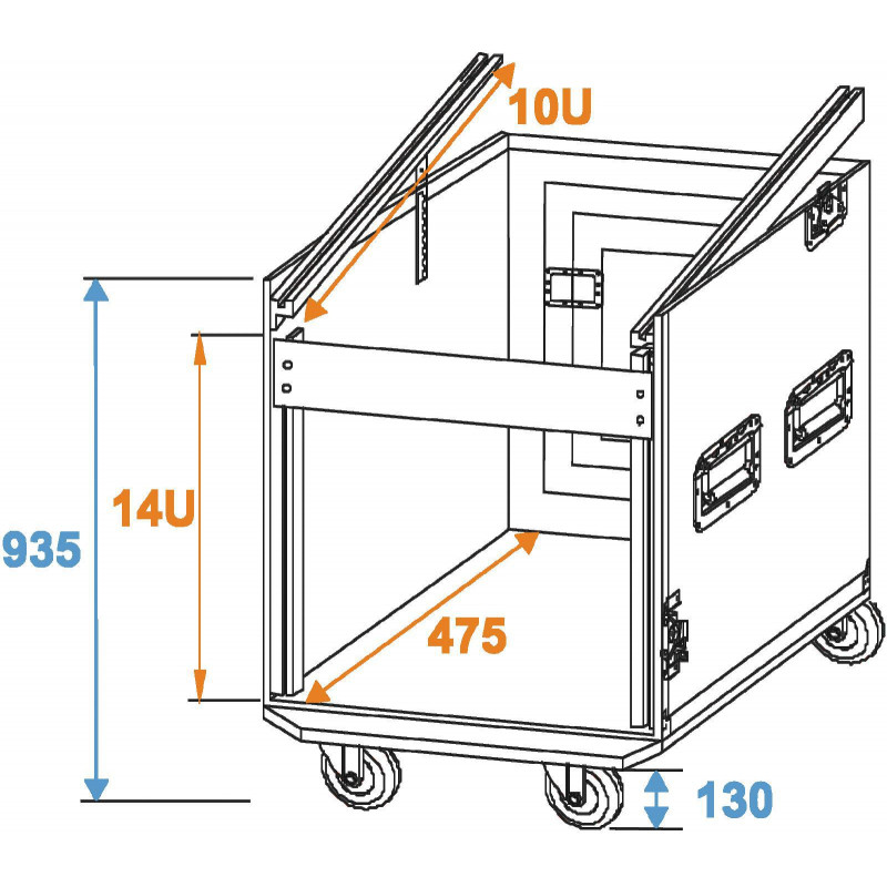- Parte superiore con guide profilate verso l'alto con 10 U per unità a comando superiore, ad es. Mixer, unità di controllo di lettori CD doppi o unità di illuminazione