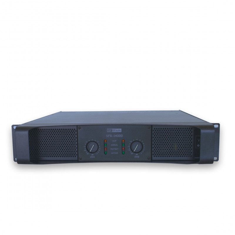SPECIFICATIONSSFR-140008 Ohm, Stereo Output Power2 X 2000 W RMS4 Ohm, Stereo Output Power2 X 3000 W RMS8 Ohm, Bridge Output Power6000 W RMSFrequency Response20Hz-20KHz ±0.5dBTHD+N (20Hz-20KHz)<0.08%Slew Rate40V/µsDamping Factor (8?, 20Hz-1KHz)400Voltage Gain (rated power @8?)40.8dBSignal to Noise Ratio>95dBCrossTalk (20-20KHz)>70dBInput Sensitivity (8?)0.775V/1.0V/1.4VInput Impedance20K? balance/ 10K? unbalanceCoolingTwo variable speed fans, rear-to-front air flowConnectors (each channel)Input: XLR Output: Speakon, connectorControlsFront: AC Switch, Ch1 and Ch2 gain knobs; Rear:Sensitivity switch, GND switch, Stereo/Parallel/Bridge switch, 30Hz Low cut switch, :clip limiter switch, 150Hz Low passswitchIndicatorsFront: STANDBY- orange LED, POWER- White LED, SIGNAL- green LED, CLIP-Red LED, PROT-Red LED; RearBridge orange LEDAmplifier Protectionshort circuit, thermal, over load, clip limiter, DC voltage, soft star, ultrasonic and RF protectionNet weight/Gross weight18Kg/22Kg