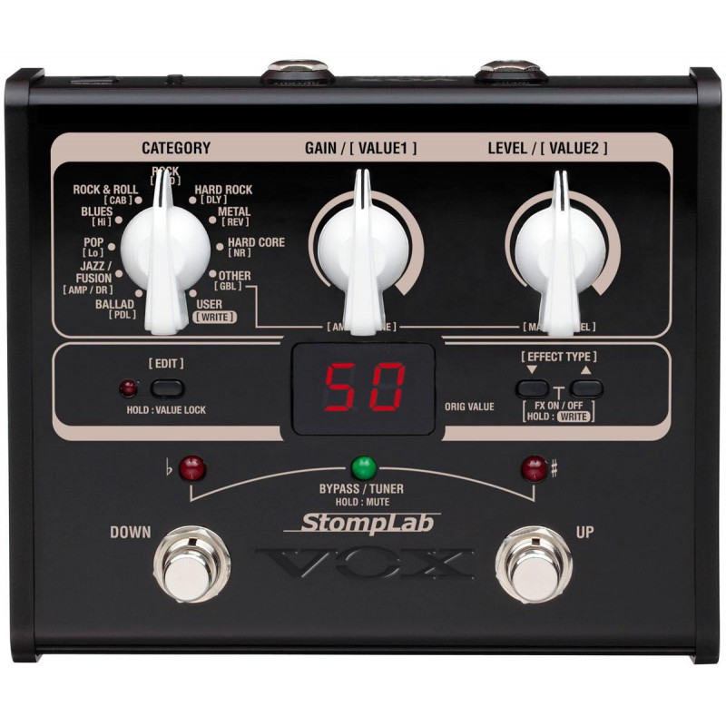 PEDALE PIEDE MULTI EFFETTO PER CHITARRA VOX StompLab IG Multieffetto per chitarra. La serie di pedali effetti StompLab rappresenta un progresso impressionante in suoni potenti in un corpo metallico compatto e sofisticato. Le variazioni sonore sono classificate in base allo stile, come rock, blues e ballate, rendendo facile anche agli utenti inesperti la selezione del suono desiderato. Nº di effetti: StompLab IG: 103. Nº di programmi: 120 (Utente = 20 / Preimpostazione = 100). Ingresso audio: 1 (Mono). Uscita audio: OUTPUT / PHONES (Stereo). Elaborazione del segnale: conversione A / D: 24 bit, conversione D / A: 24 bit. Sintonizzatore: Campo di sintonia: A0 - E6, Campo di calibrazione: A = 438 Hz? 445 Hz. Potenza: batterie AA x 4, DC 9 V (opzionale: adattatore CA). Durata della batteria: 7,5 ore (batteria alcalina).