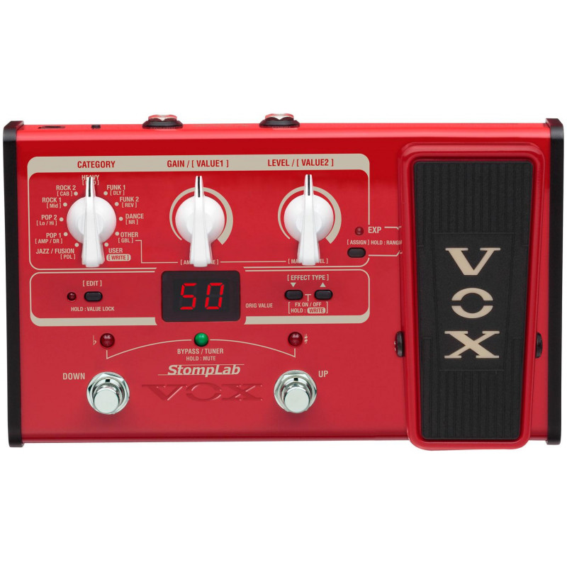 VOX StompLab IIB PEDALE BASE PAVIMENTO MULTI EFFETTO per basso. La serie di pedali effetti StompLab rappresenta un progresso impressionante in suoni potenti in un corpo metallico compatto e sofisticato. Le variazioni sonore sono classificate in base allo stile, come rock, blues e ballate, rendendo facile anche agli utenti inesperti la selezione del suono desiderato. N. effetti: StompLab IIB: 61. N. di programmi: 120 (Utente = 20 / Preimpostazione = 100). Ingresso audio: 1 (Mono). Uscita audio: OUTPUT / PHONES (Stereo). Elaborazione del segnale: conversione A / D: 24 bit, conversione D / A: 24 bit. Sintonizzatore: Campo di sintonia: A0 - E6, Campo di calibrazione: A = 438 Hz? 445 Hz. Potenza: batterie AA x 4, DC 9 V (opzionale: adattatore CA). Durata della batteria: 7,5 ore (batteria alcalina).