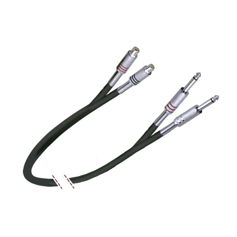 Parallel cable of double connection, special for audio. 2 x Jack connectors 1/4 "mono - 2 x RCA female connectors Color ID 1 conductor 20 x 0.12 mm + mesh Black color Length: 5m