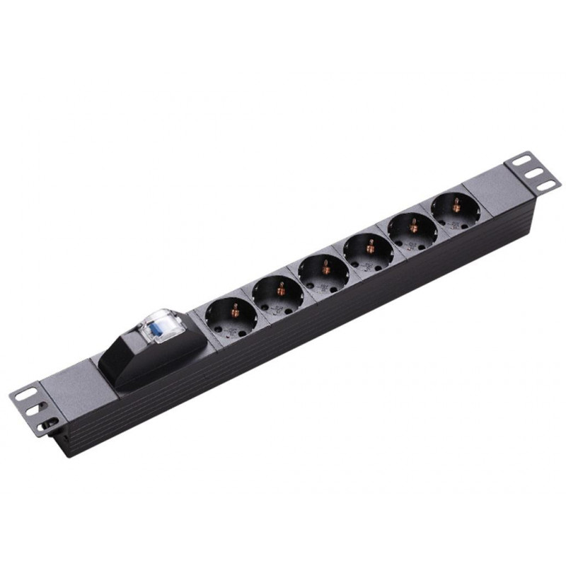 Connection base with aluminum profile of 1.5 unit of rack of 19 ?, with 6 base connectors schuko females and switch and circuit of protection for overloads. Cable of 2 meters and 1.5 mm section.