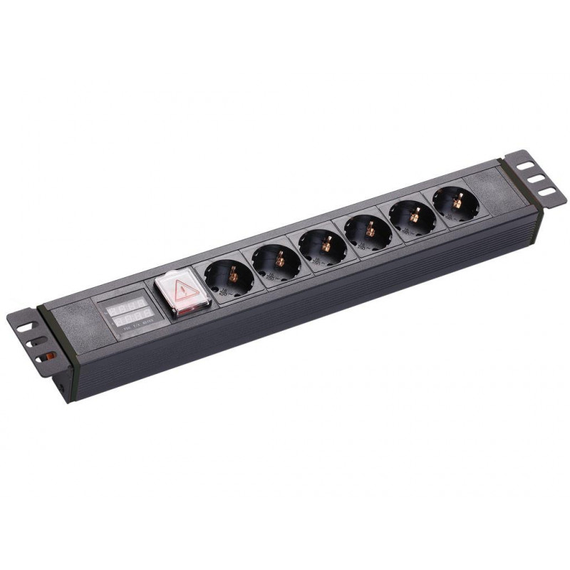 Base of connection with aluminum profile of 1 unit of rack of 19 ?, with 6 base connectors schuko females plus 1 bipolar magnetothermic of protection, plus display of vision of voltage and current. Cable of 2 meters and 1.5 mm section.
