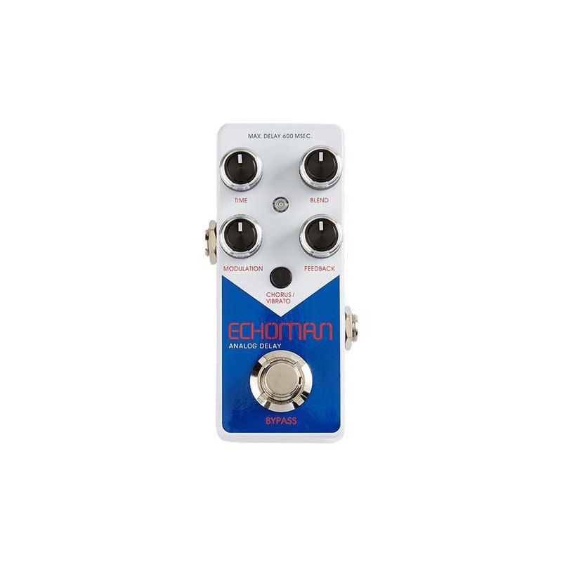 PEDALE DELAY L'Echoman è un pedale delay analogico compatto e di qualità progettato dal guru dei pedali Howard Davis. Il suo cuore elettronico è costituito dal nostro chip MN3005, che è diventato anche il chip delay preferito da molte altre marche di pedali. Questo piccoletto genera ritardi fino a 600 ms e consente la modulazione di chorus, tremolo e auto-oscillazione.