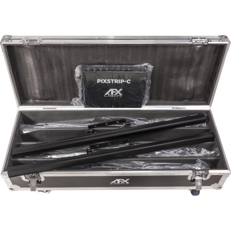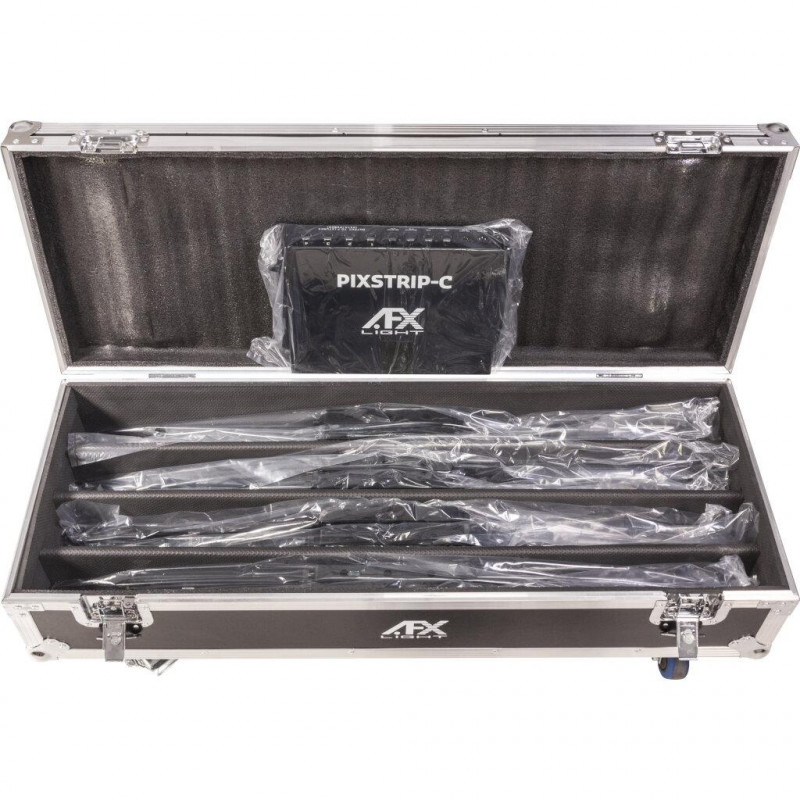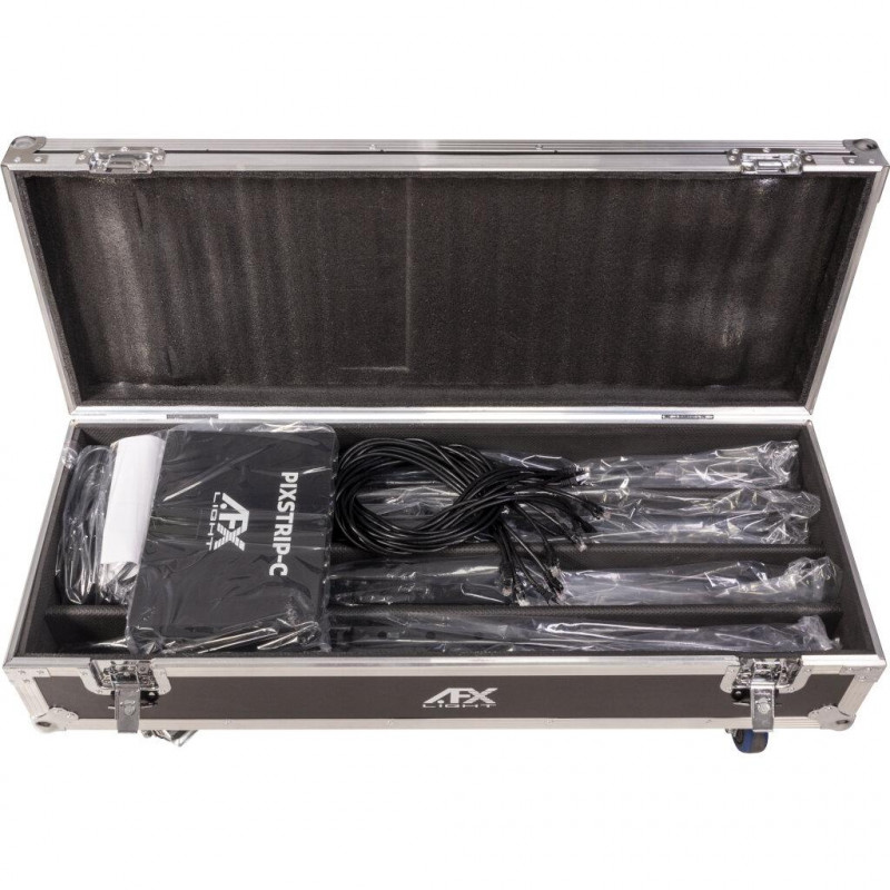 Conjunto de 8 PIXSTRIP40, 1 PIXSTRIP-C (controlador), 1 flightcase e 8 cabos RJ45. A PIXSTRIP40 é uma luminária de vídeo linear para o mercado de locação ou instalação fixa em clubes, bares e pequenos palcos. O efeito é particularmente impressionante quando várias unidades trabalham juntas para criar várias configurações em qualquer orientação. Descrição do PIXSTRIP40: