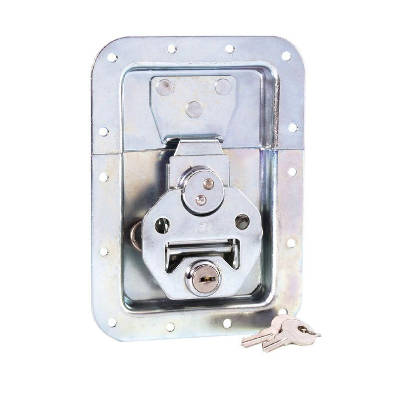 Cierre de mariposa grande con resorte y cerradura, embutido en una base de 14 mm de profundidad.