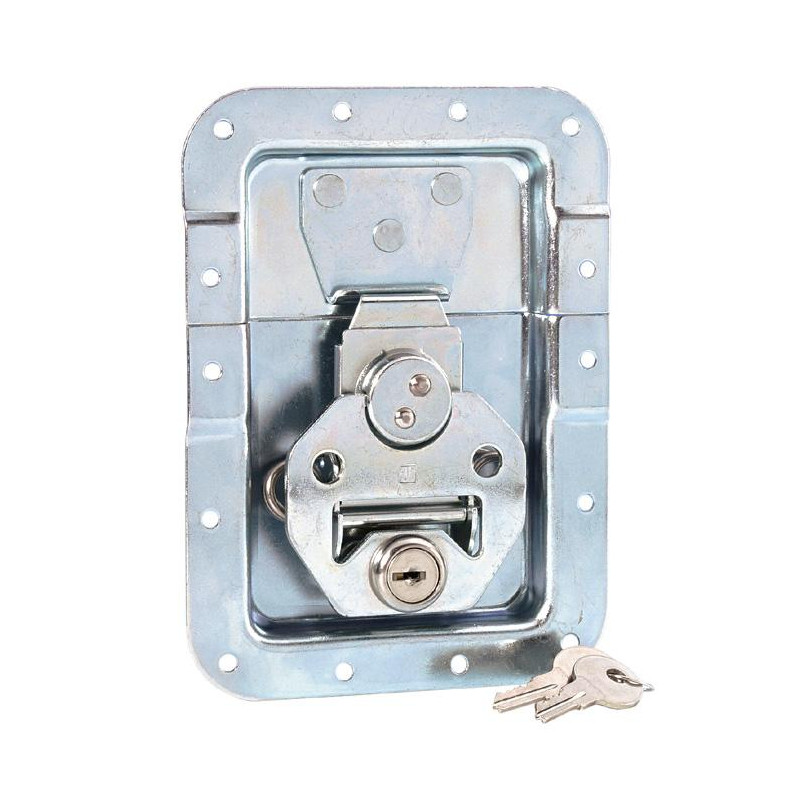 Cierre de mariposa grande con resorte y cerradura, embutido en una base de 14 mm de profundidad, con paso de perfil para quedar a ras.