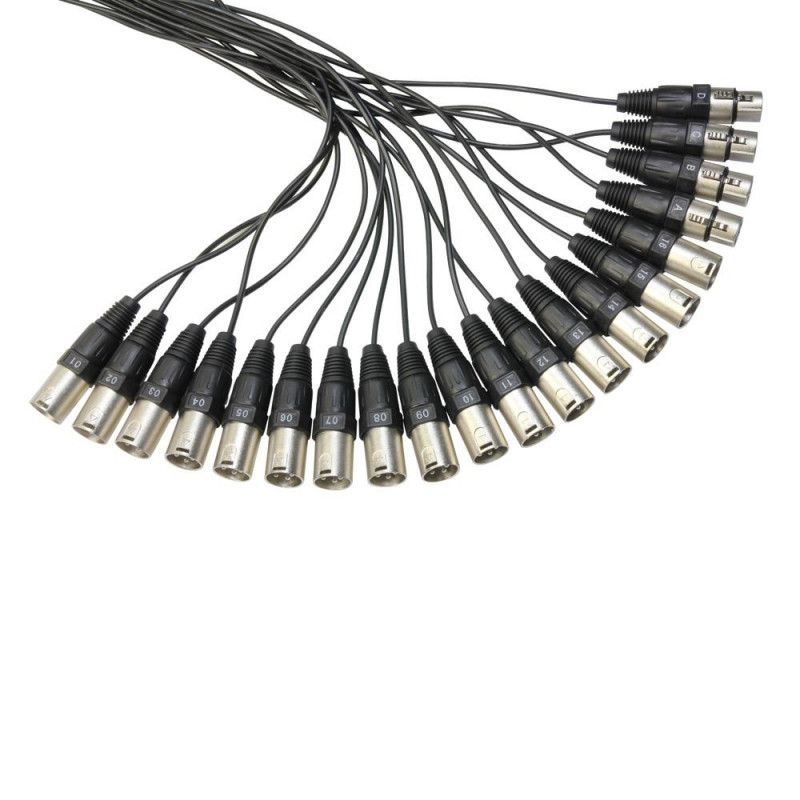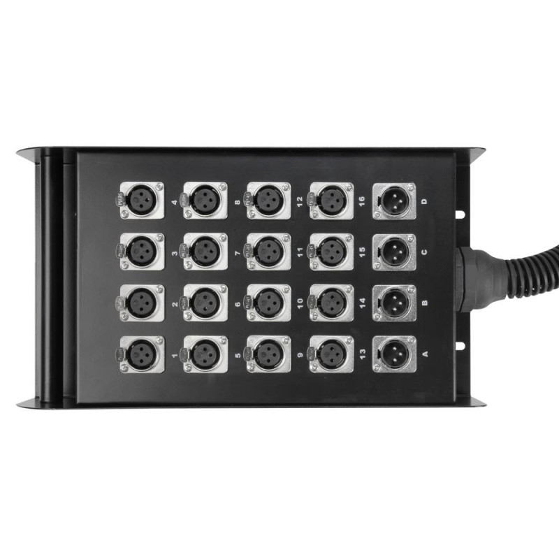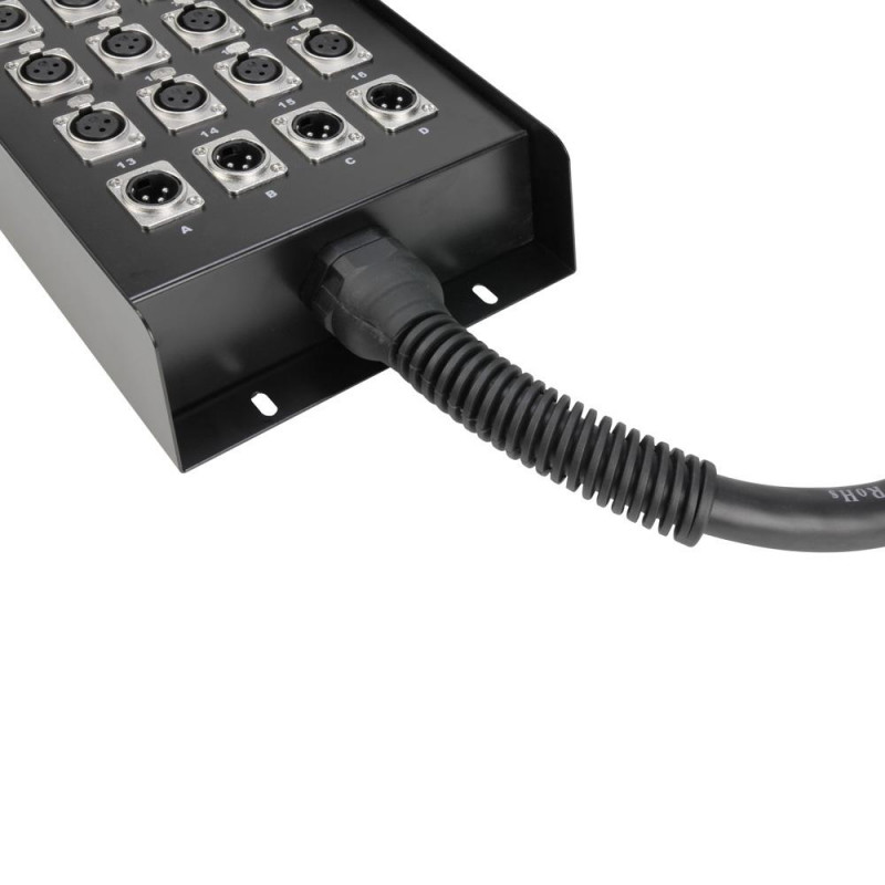 Sólida carcasa de acero con pintura texturizada negra y asa de transporte. Los conectores XLR de superficie y aéreos son metálicos. Manguera multipar de alta calidad con código numérico en los cables individuales.