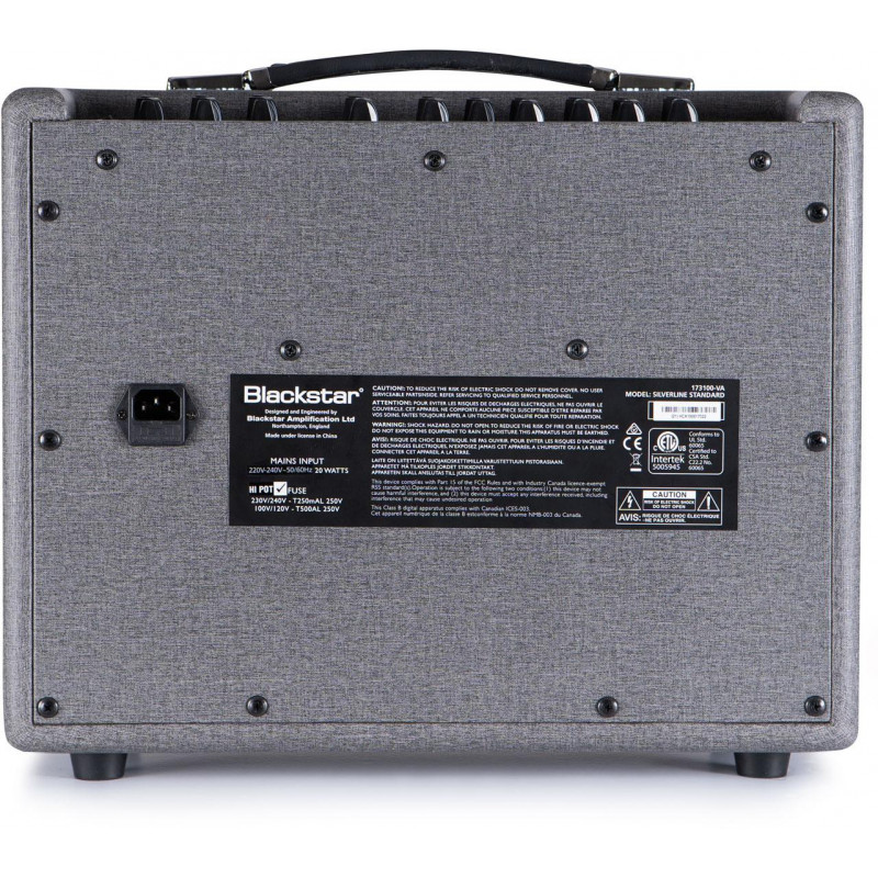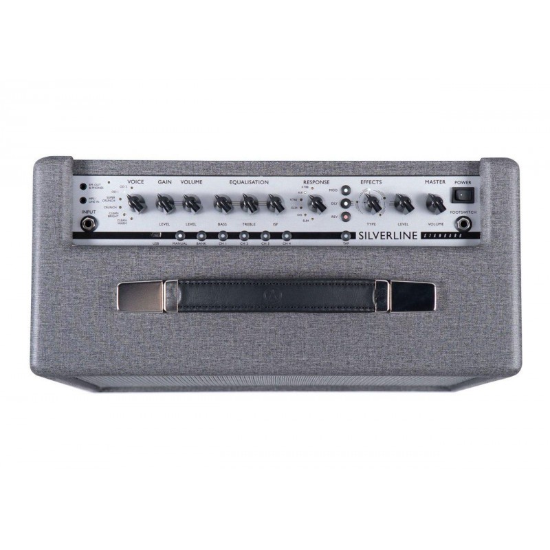 GUITAR COMBO AMPLIFIER Amplificador combo digital programável para guitarra elétrica SILVERLINE STANDARD 20W de potência. Tecnologia True Valve Power clássica com o novo DSP `` SHARC ''. 6 vozes (Clean Warm, Clean Bright, Crunch, Super Crunch, OD 1, OD 2). ISF (Recurso de forma infinita). 128 bancos de memória com 4 memórias (CH1, 2, 3 e 4). Efeitos integrados. Emulador de válvula com 6 tipos de válvula. Controles EQ Bass e Treble. Controle de volume mestre. Porta USB para gravação e edição usando software. Entrada auxiliar para Cd ou Mp3. Saída de simulação de alto-falante. Sintonizador embutido. Alto-falante Tipo V de 10 '' Celestion. Acabamento em tolex prata "Boutique Silver" com logo metálico na frente. Pedal multifuncional opcional (FS-10)