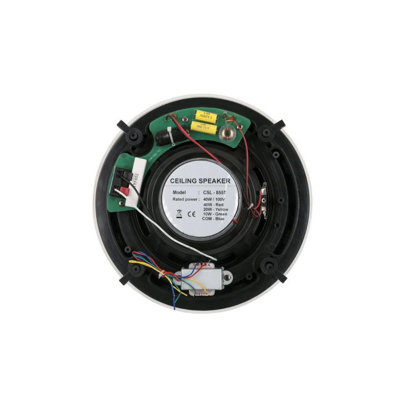 Potencia nominal: 40/20/10 W Voltaje de línea: 100 V Impedancia: 5,8 ? Tamaño del altavoz de graves: 8 pulgadas Tamaño del altavoz de agudos: 1 pulgada Respuesta de frecuencia: 50-20 kHz Sensibilidad: 90 dB Material: ABS Color: Blanco Grado de protección IP: IP40 Orificio de montaje: 245 mm de Ø Medidas (largo x ancho x alto): 281 x 110 Peso: 2,61 kg