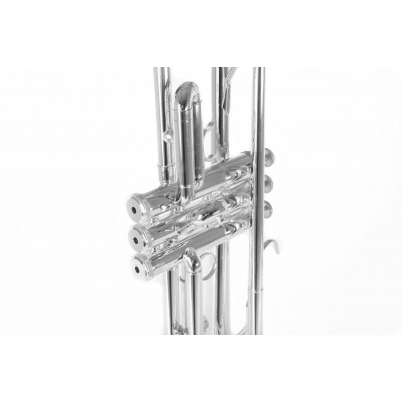 Cano de chumbo ML. Campainha de latão. Cano de chumbo de latão banhado a ouro. Corrediças externas de níquel prata. Pistões de aço inoxidável. Anel na 3ª válvula. Apoio de polegar na 1ª válvula. 2 chaves de drenagem. banhado a prata. Caixa retangular leve com mochila.